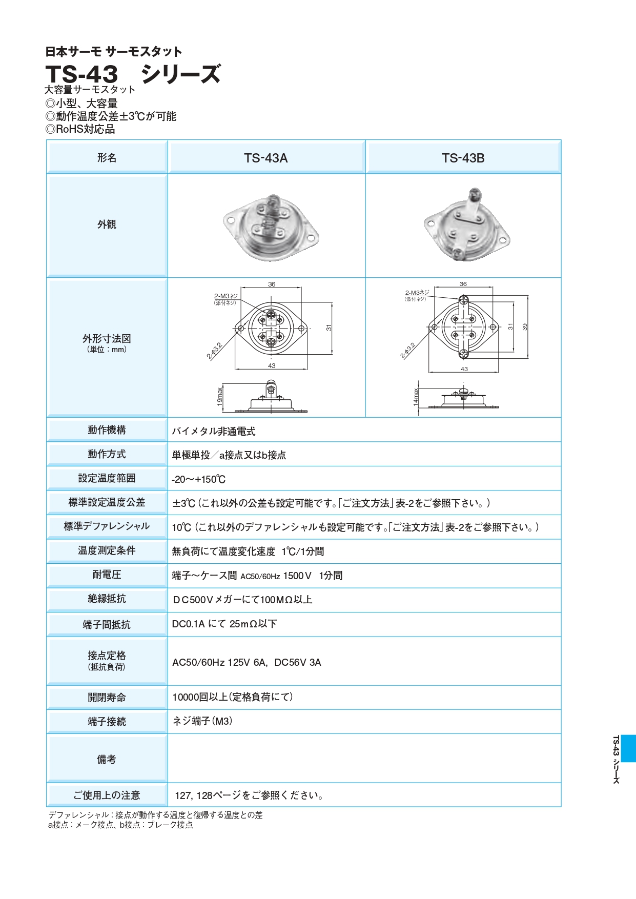 大容量 (43mm,接点:AC125V・6A /DC56V・3A) 型名:TS-43 シリーズ 大容量サーモスタット